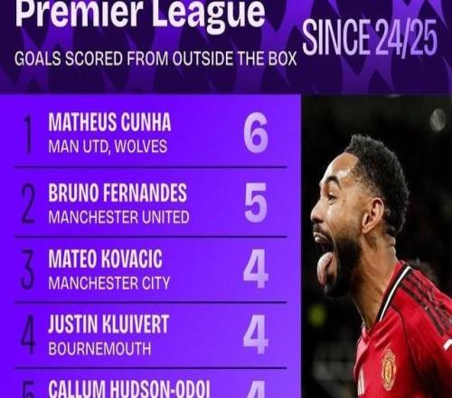 上赛季至今英超禁区外进球球员榜:库尼亚6球领跑,B费5球第二