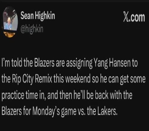 开拓者队记Sean Highkin对此跟进报道称,之所以下放杨瀚森是为了让他收获到更多的训练时间,将在北京时间本周二主场VS湖人的比赛中回归。