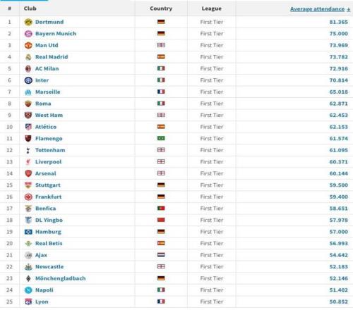 1.多特蒙德 场均81365名观众