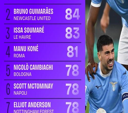 2025五大联赛被犯规榜:拉齐奥前锋扎卡尼114次,吉马良斯第二